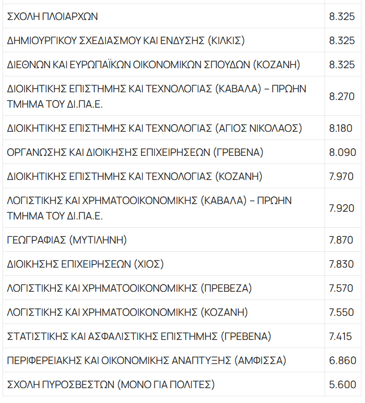 Οι σχολές που έπεσαν κάτω από 10.000 μόρια είναι οι εξής: