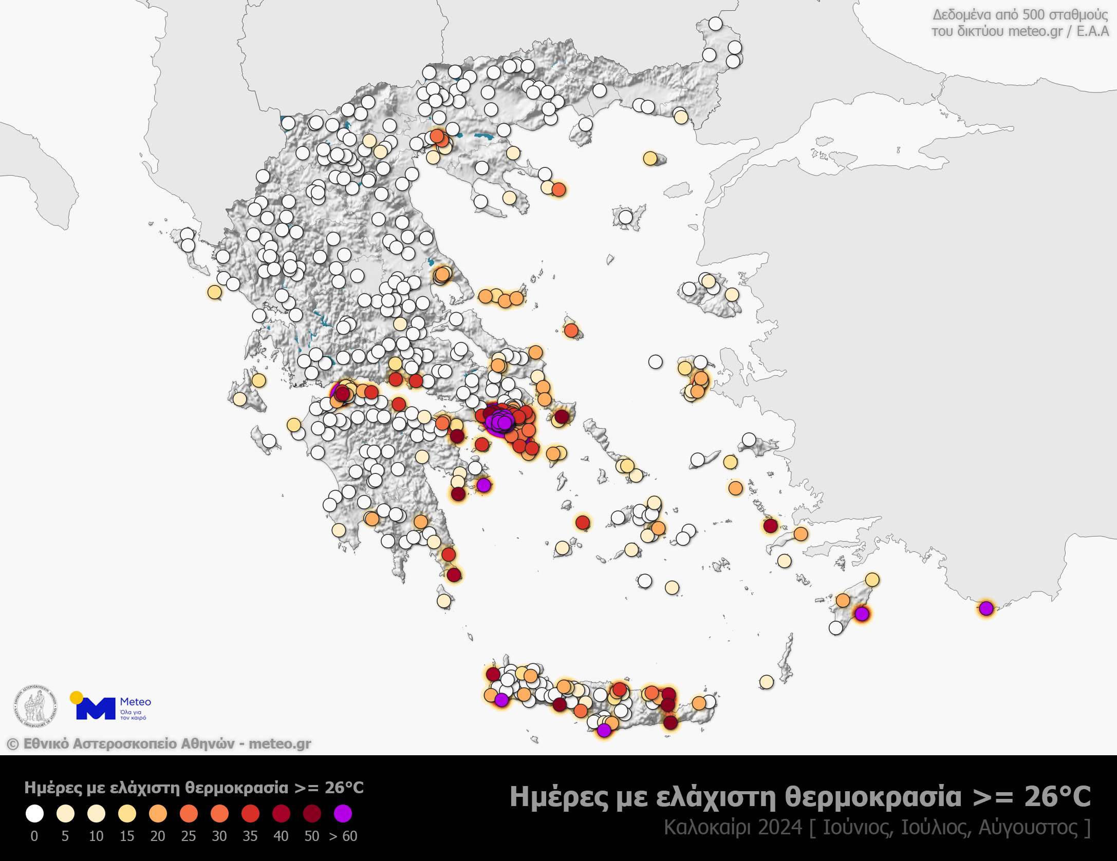 Στην Εικόνα 2 παρουσιάζονται για κάθε μετεωρολογικό σταθμό οι συνολικές ημέρες κατά τη διάρκεια του καλοκαιριού 2024 όπου η θερμοκρασία διατηρήθηκε πάνω από τους 26 °C.