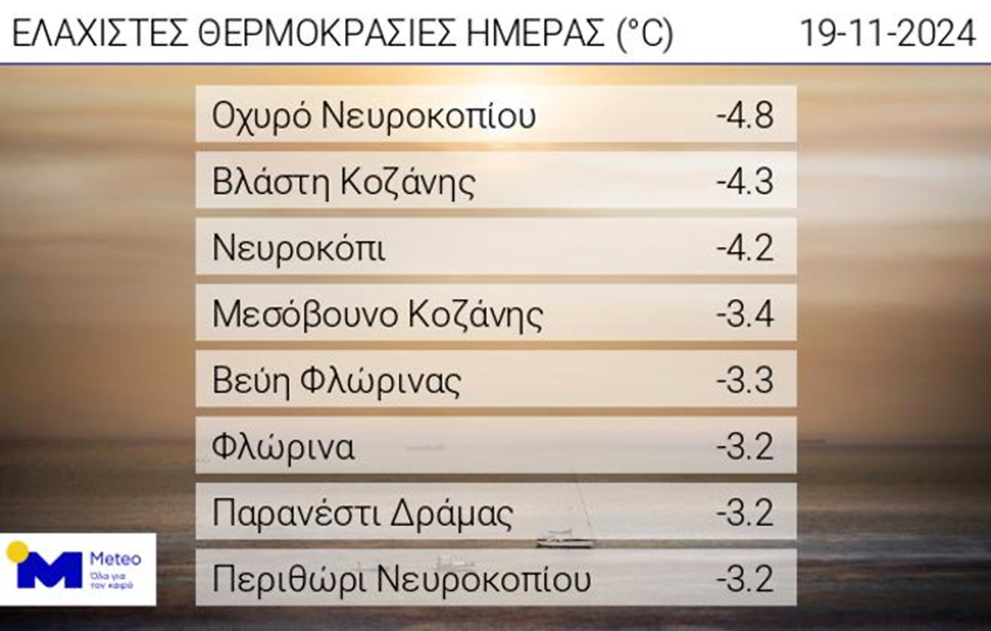 Σύμφωνα με το δίκτυο αυτόματων μετεωρολογικών σταθμών του meteo.gr / Εθνικού Αστεροσκοπείου Αθηνών, η ελάχιστη σημειώθηκε στο Οχυρό Νευροκοπίου η θερμοκρασία ήταν -4.8 °C και ακολούθησαν η Βλάστη Κοζάνης -4.3°C και το Νευροκόπι -4.2°C.