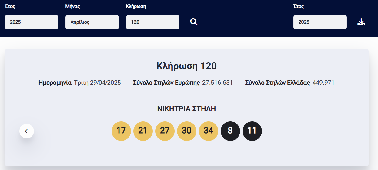 Οι τυχεροί αριθμοί είναι οι εξής: 17, 21, 27, 30, 34, και 8,11.