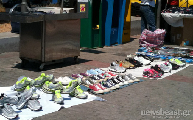 Οι φωτογραφίες που βλέπετε, είναι έξω από τη στάση μετρό Αγίου Δημητρίου. Εκεί οι μετανάστες έχουν στήσει πάγκους με τα μαϊμού προϊόντα: από τσάντες και γυαλιά που είναι τα συνηθέστερα είδη προς πώληση μέχρι αθλητικά παπούτσια και είδη ρουχισμού.