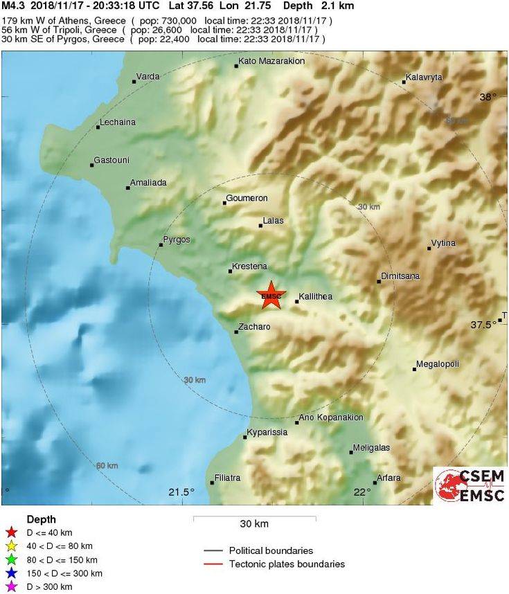 Σεισμός έγινε αισθητός πριν από λίγο στην Πελοπόννησο, με το επίκεντρο να εντοπίζεται κοντά στην Αρχαία Ολυμπία.