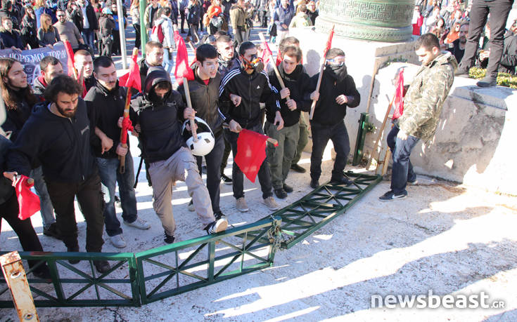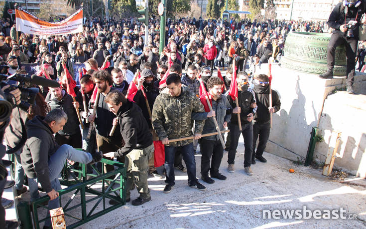 Για ακόμη μια φορά δεν αποφεύχθηκε η ένταση στο εκπαιδευτικό συλλαλητήριο, με μερίδα διαδηλωτών να προσπαθεί να σπάσει τον αστυνομικό κλοιό έξω από τη Βουλή, χρησιμοποιώντας τις σημαίες που είχαν στα χέρια τους. Οι άνδρες των ΜΑΤ τους απώθησαν με τη χρήση των ασπίδων τους.