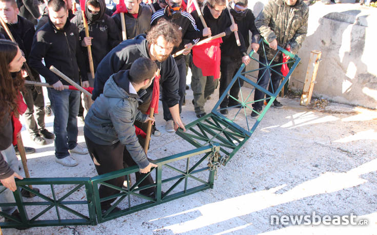 Οι διαδηλωτές έριξαν και έναν μικρό φράκτη, ο οποίος τους κλείνει τον δρόμο προς τους άνδρες των ΜΑΤ.