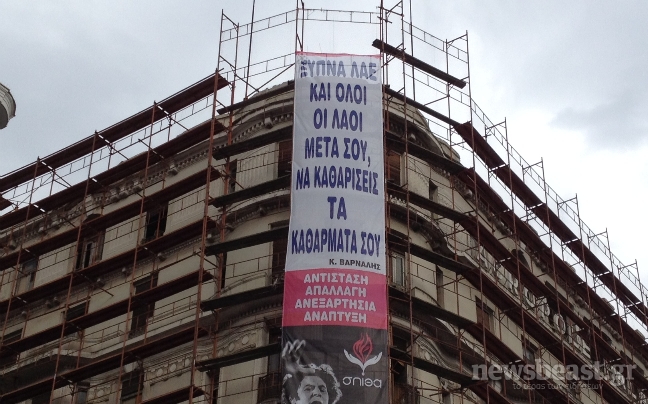 Πανό με στίχους του Κώστα Βάρναλη έχει αναρτήσει το Κίνημα Ανεξαρτήτων Πολιτών, σε κτίριο απέναντι από το Πολυτεχνείο, όπου συνεχίζεται η κατάθεση στεφάνων για την39η επέτειο από την εξέγερση.