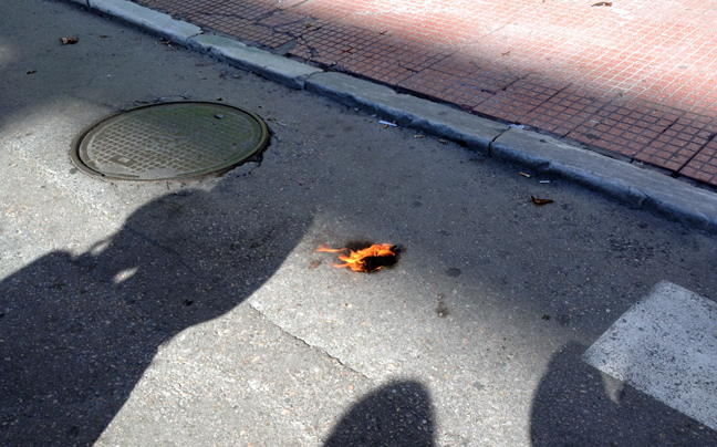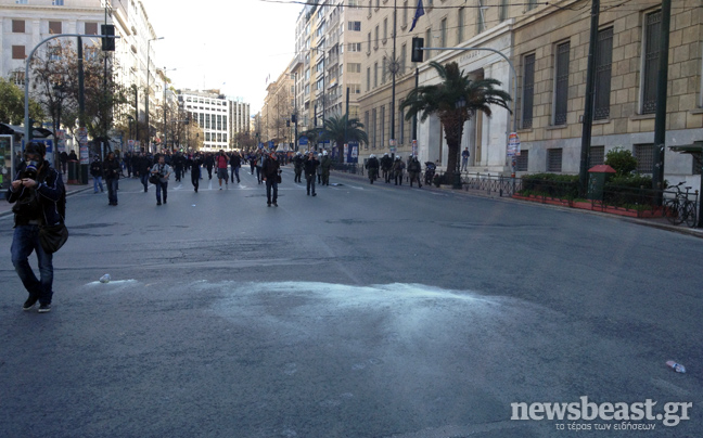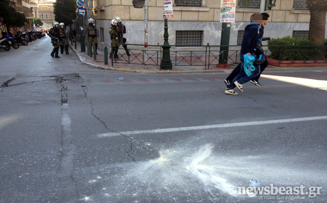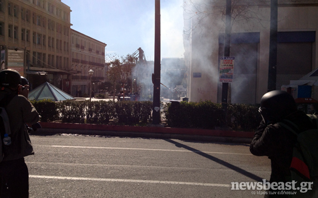 Ομάδα νεαρών έριξε τρεις βόμβες μολότοφ κατά αστυνομικών των ΜΑΤ που βρίσκονταν στο σημείο, οι οποίοι απάντησαν με χημικά και κρότου λάμψης.