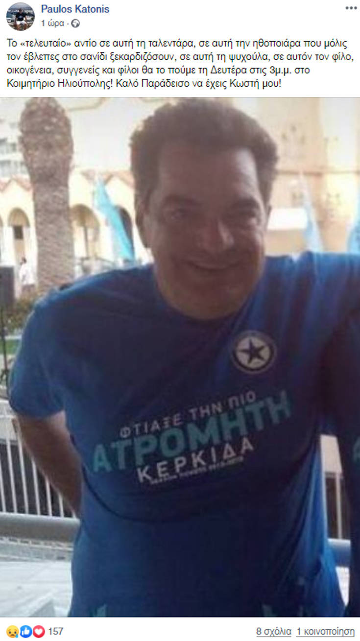 «Καλό ταξίδι αγαπημένε μου φίλε! Έδωσες μια μεγάλη μάχη με αξιοπρέπεια! Ο πόνος είναι πολύ μεγάλος! Χάρισες πολύ γέλιο σε όλη την Ελλάδα και σήμερα όλη η Ελλάδα κλαίει για σένα! Θα σε θυμάμαι πάντα έτσι χαμογελαστό παλικάρι μου! Θα είμαστε όλοι κοντά σου Κωστή μου, Παλιέ μου, Ατρόμητε μου!», ήταν το συγκινητικό μήνυμα που συνόδευσε τη φωτογραφία.