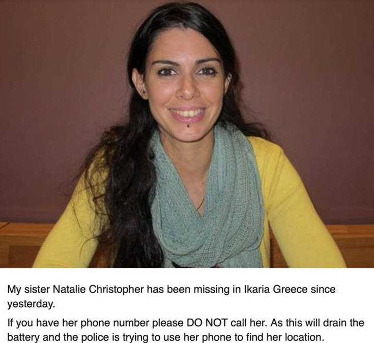 Η αδελφή της Jana Christopher κάλεσε όσοι ανησυχούν για εκείνη να μην την καλούν στο κινητό της. «Η αδελφή μου Natalie Christopher έχει εξαφανιστεί από την Ικαρία από χθες. Αν έχετε τον αριθμό της σας παρακαλώ μην την καλέσετε. Αυτό μπορεί να τελειώσει τη μπαταρία της και η αστυνομία προσπαθεί να την εντοπίσει μέσω του κινητού της» έγραψε στο facebook.