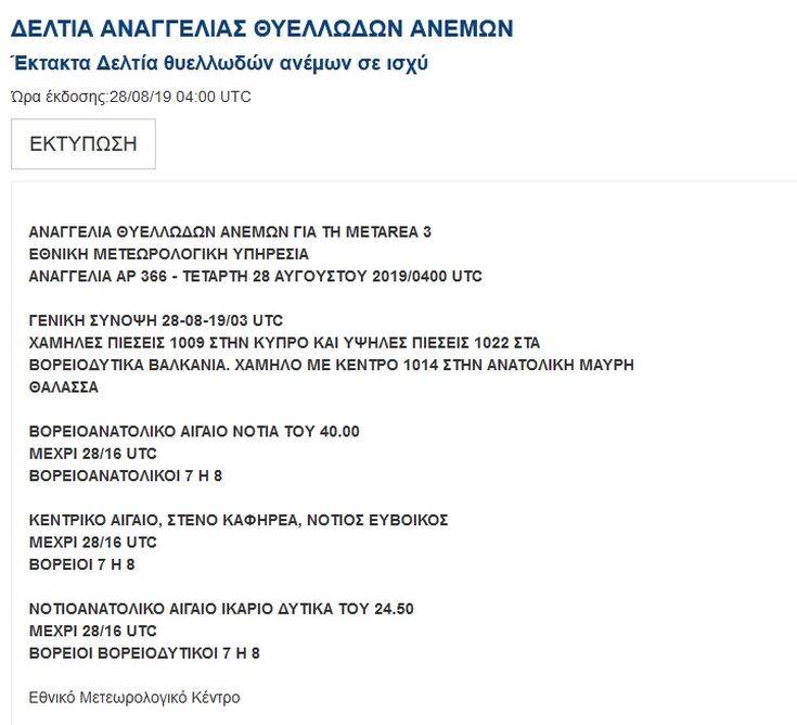 Έκτακτο δελτίο θυελλωδών ανέμων εξέδωσε η Εθνική Μετεωρολογική Υπηρεσία. Σύμφωνα με αυτό οι άνεμοι θα φτάνουν τα 7-8 μποφόρ στο βορειοανατολικό, νοτιοανατολικό και Κεντρικό Αιγαίο.