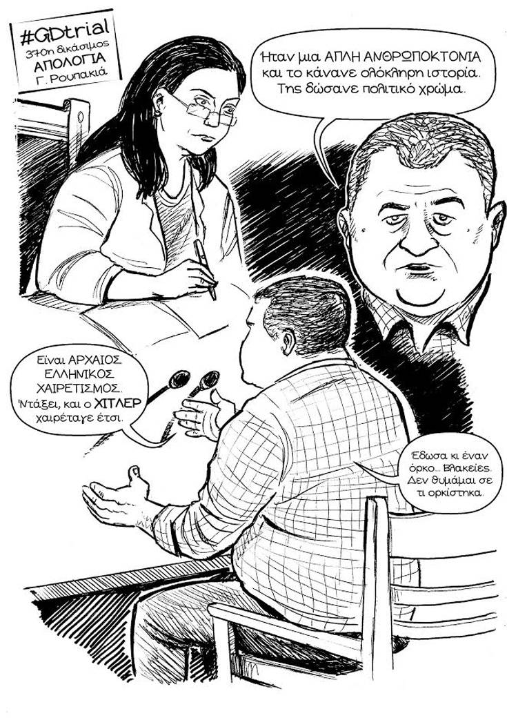 (Σκίτσα του John Antono από τη δίκη της Χρυσής Αυγής, τα οποία παραχώρησε ο ίδιος στο ΑΠΕ-ΜΠΕ για χρήση. Copyright: John Antono)