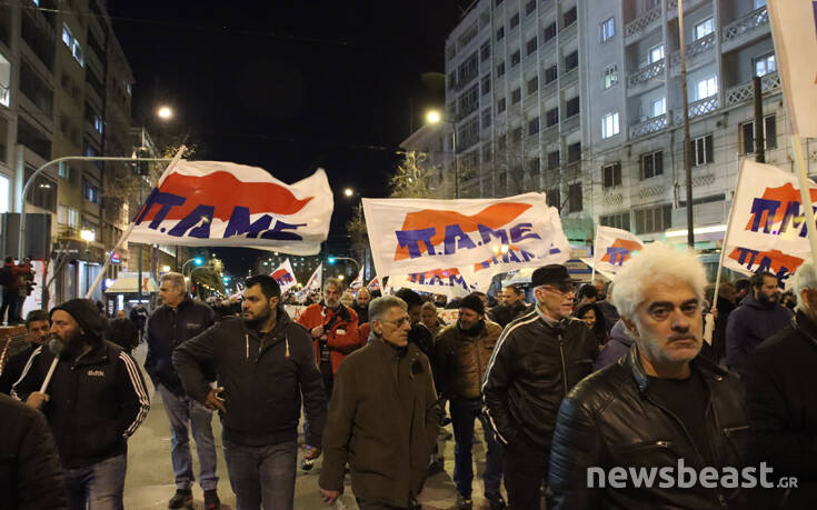 «Να αποσυρθεί ο νόμος λαιμητόμος Κατρούγκαλου – Βρούτση», γράφει το πανό που βρίσκεται στην κεφαλή της πορείας του ΠΑΜΕ, που ξεκίνησε από τα Προπύλαια και κατέληξε στο Σύνταγμα.