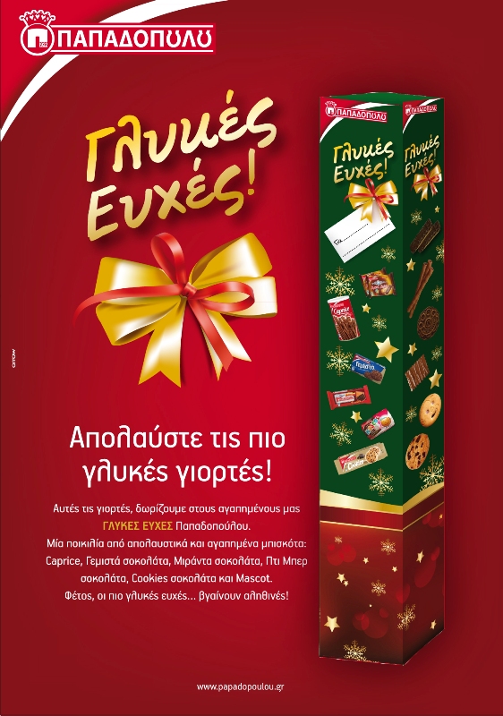 – Η εορταστική συσκευασία «Γλυκές Ευχές» με τα λατρεμένα Caprice, Γεμιστά, Cookies, Μιράντα Σοκολάτα και Mascot χαρίζει μοναδικές στιγμές απόλαυσης.