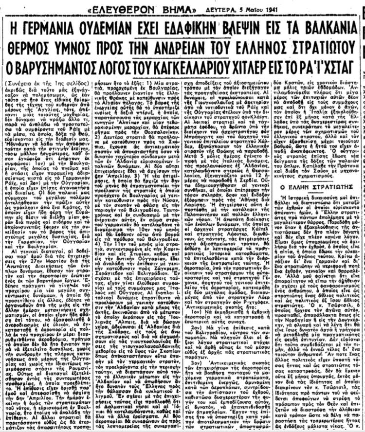 Από την πλευρά του το «Ελεύθερον Βήμα» κάνει λόγο για «βαρυσήμαντο λόγο του καγκελάριου Χίτλερ διά τον πόλεμον εις τα Βαλκάνια» και στον υπότιτλο αναφέρει ότι «εξήρε την γενναιότητα και τον ηρωισμόν του ελληνικού στρατού και ετόνισεν ότι η ευθύνη δεν βαρύνει τον λαόν, αλλά τον βασιλέα και την ευάριθμον κλίκαν των κυβερνητών του».