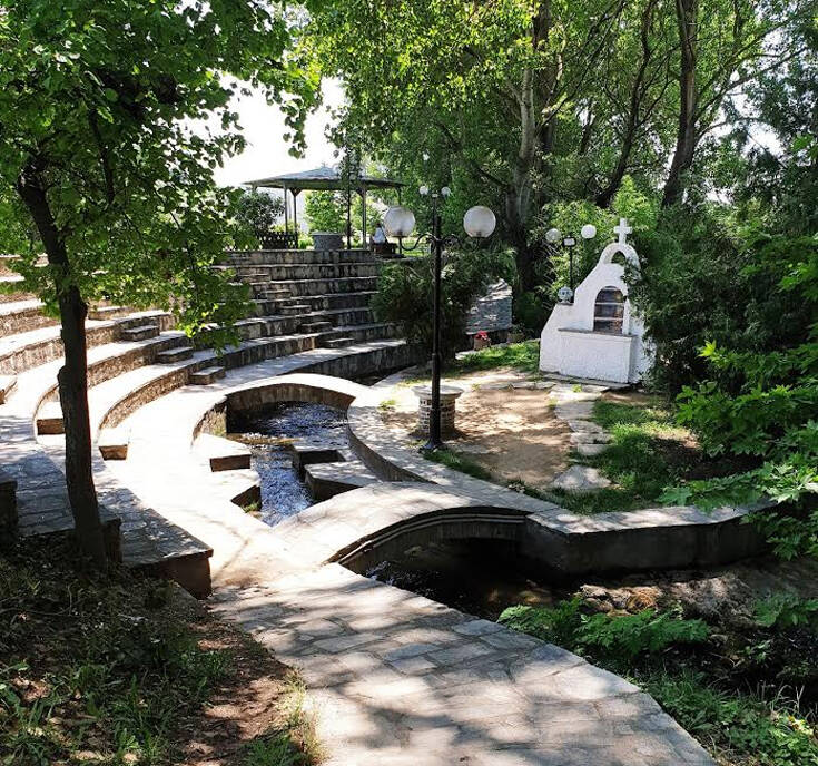 Ο εξωτερικός περίβολος είναι εξίσου εντυπωσιακός. Εκεί υπάρχει το υπαίθριο βαπτιστήριο κάτω από τα αιωνόβια πλατάνια και τις οξείες, δίπλα στα τρεχούμενα γάργαρα νερά, μέσα σε μια κατάφυτη έκταση όπου το φυσικό και το αρχαίο κάλλος δένουν αρμονικά και συναρπάζουν τον επισκέπτη.