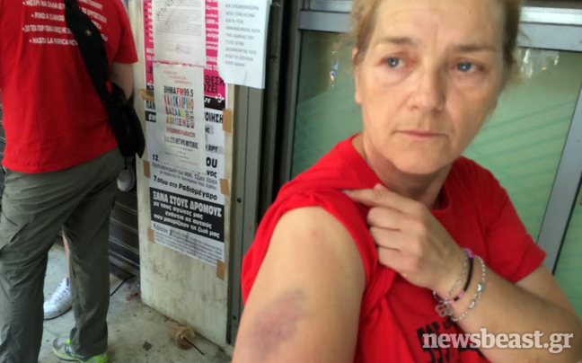 Με πισώπλατα χτυπήματα αστυνομικοί επιτίθενται στις καθαρίστριες που έχουν κατασκηνώσει στο υπουργείο Οικονομικών. Έχοντας-κάποιοι τουλάχιστον-σιδερογροθιές στα γάντια τα βάζουν με γυναίκες, οι οποίες είναι ανήμπορες να αντιδράσουν.