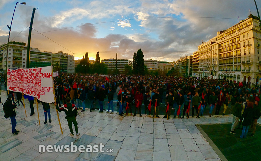 Φοιτητικοί σύλλογοι, μαθητές, εκπαιδευτικοί σύλλογοι-ομοσπονδίες-σωματεία, καθώς και άλλα εργατικά σωματεία και φορείς έχουν συγκεντρωθεί στο Σύνταγμα, ζητώντας να αποσυρθεί το νομοσχέδιο του υπουργείου Παιδείας, το οποίο ψηφίζεται σήμερα.