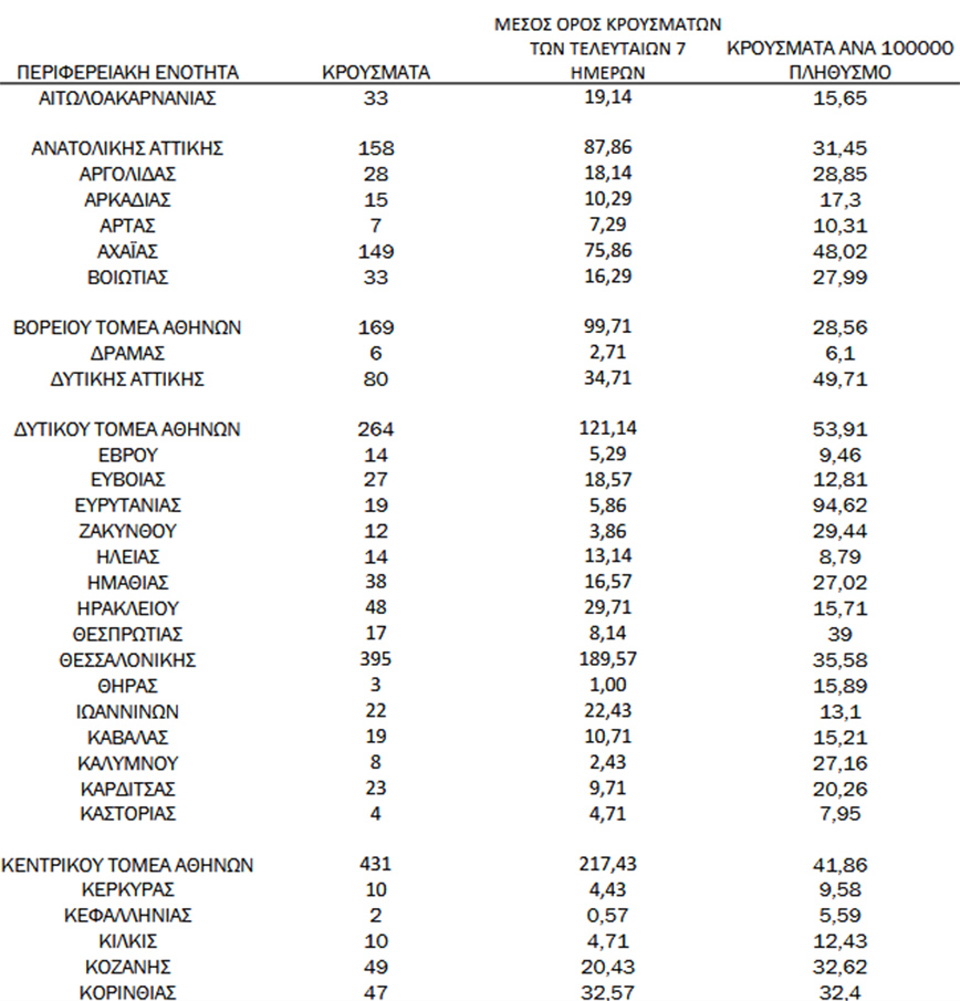 Συγκεκριμένα η Αττική έχει 1.572 νέα κρούσματα, με το κέντρο της Αθήνας να έχει 431 νέες μολύνσεις και τον Πειραιά 301.