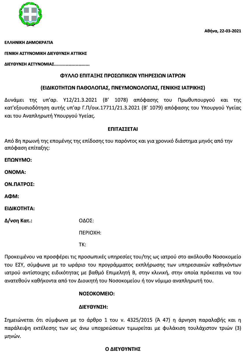 Σε εξέλιξη βρίσκεται η διαδικασία παράδοσης των φύλλων επίταξης προσωπικών υπηρεσιών των ιδιωτών γιατρών στην οποία προχώρησε το υπουργείο Υγείας στην Αττική και ανέλαβε να διεκπεραιώσει η Αστυνομία.