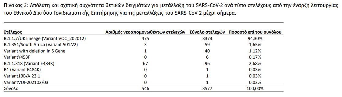 Συνολικά έχουν ταυτοποιηθεί 3.373 θετικά για την παρουσία μετάλλαξης Β.1.1.7/UK lineage (Variant VOC_202012) και 59 θετικά για την παρουσία μετάλλαξης B.1.351/South Africa (Variant 501.V2) από την έναρξη λειτουργίας του Εθνικού Δικτύου Γονιδιωματικής Επιτήρησης για τις μεταλλάξεις του SARS-CoV-2 έως σήμερα.