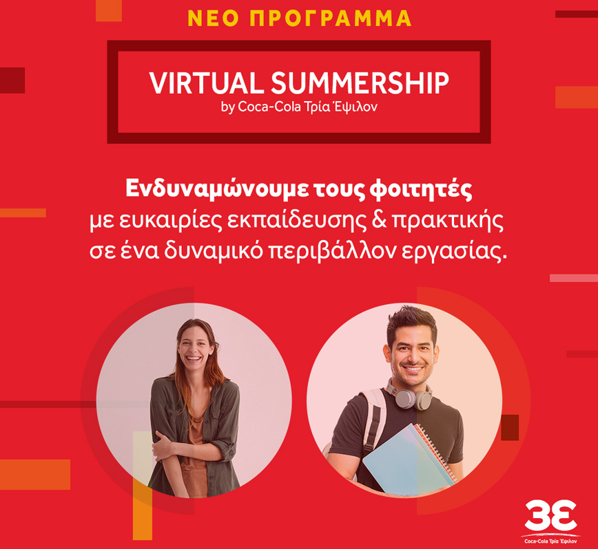 Η Coca-Cola Τρία Έψιλον, δίνει τη δυνατότητα σε 30 φοιτητές και φοιτήτριες, που βρίσκονται στο 3ο και 4ο έτος των σπουδών τους, να εκπαιδευτούν στο εργασιακό περιβάλλον της μεγαλύτερης ελληνικής εταιρείας παραγωγής μη αλκοολούχων ποτών. Μέσα από το πρόγραμμα Virtual Summership οι συμμετέχοντες θα αποκτήσουν μια ουσιαστική επαφή με τους ρυθμούς και τις προκλήσεις της καθημερινότητας στον χώρο εργασίας, μέσα από εκπαιδεύσεις, παρουσιάσεις και εξειδικευμένα σεμινάρια. Επιπλέον, το πρόγραμμα θα προσφέρει θέσεις πρακτικής άσκησης στην εταιρεία σε συνέχεια διαδικασίας αξιολόγησης των συμμετεχόντων.