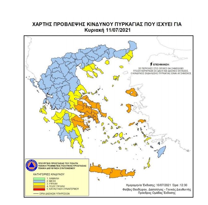 Σύμφωνα με το Χάρτη Πρόβλεψης Κινδύνου Πυρκαγιάς που εκδίδει η Γενική Γραμματεία Πολιτικής Προστασίας του υπουργείου Προστασίας του Πολίτη (www.civilprotection.gr), για αύριο Κυριακή 11 Ιουλίου 2021, προβλέπεται πολύ υψηλός κίνδυνος πυρκαγιάς (κατηγορία κινδύνου 4) για τις εξής περιοχές: