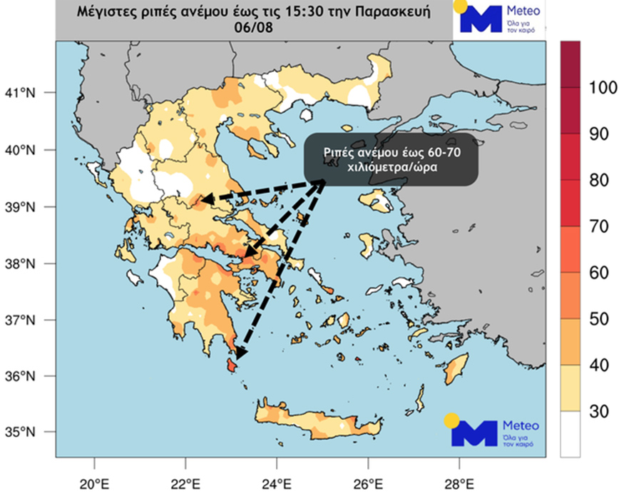 Στον παρακάτω χάρτη παρουσιαζόνται οι μέγιστες ριπές ανέμου έως τις 15:30 την Παρασκευή 6 Αυγούστου 2021: