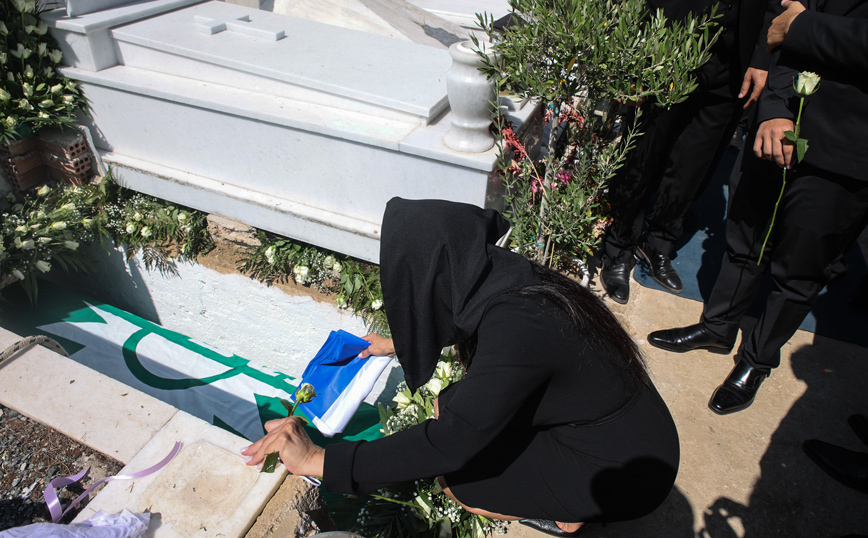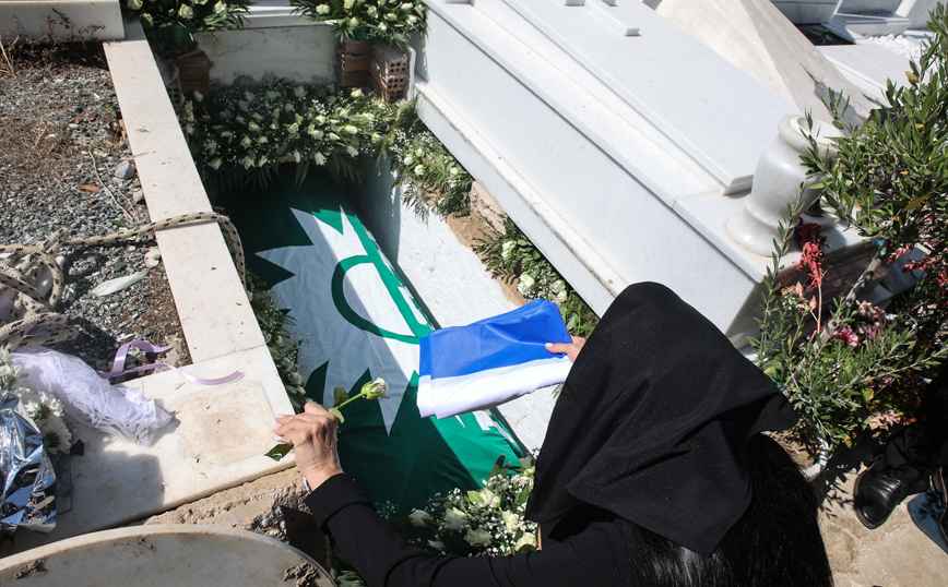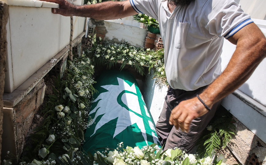 Με τη σημαία του ΠΑΣΟΚ πάνω στο φέρετρο οδηγήθηκε ο Άκης Τσοχατζόπουλος στην τελευταία του κατοικία στο Α’ Νεκροταφείο Αθηνών. Όπως φαίνεται και στις φωτογραφίες, η Βίκυ Σταμάτη κρατάει στο χέρι της και μία διπλωμένη ελληνική σημαία.
