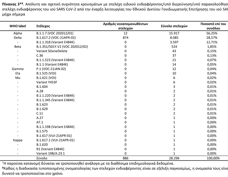 Από τα 3.055 δείγματα που έχουν ληφθεί ή επιλεγεί στοχευμένα, έχουν βρεθεί 2.892 στελέχη ειδικού ενδιαφέροντος ή υπό παρακολούθηση. Από τα δείγματα αυτά, 42,88% αφορούν στο B.1.1.318 (Variant E484K), 29,39% στο Delta, 15,58% στο Alpha, 6,58% στο Beta, 0,13% στο C.36 και 0,10% στο Gamma.