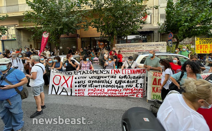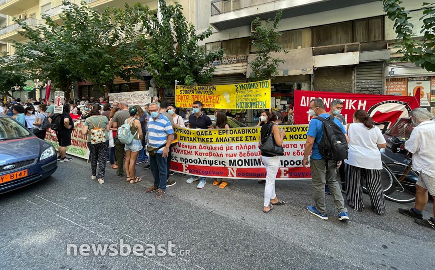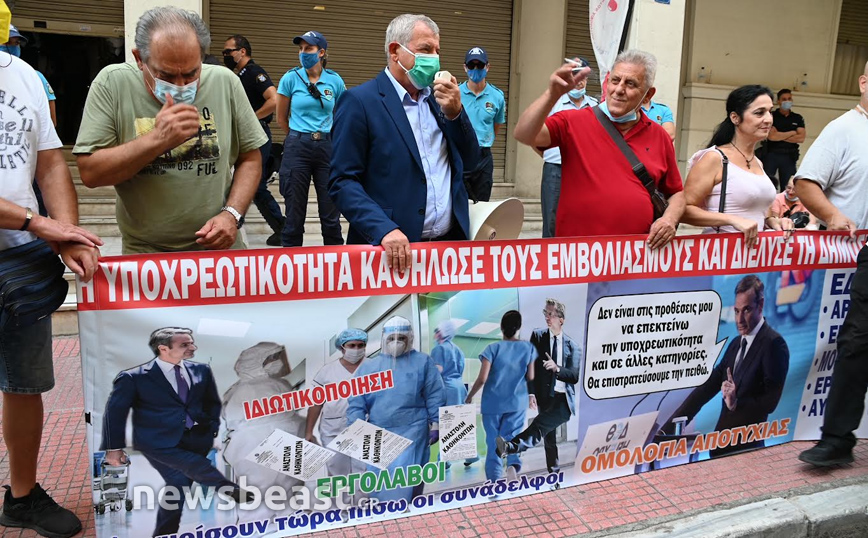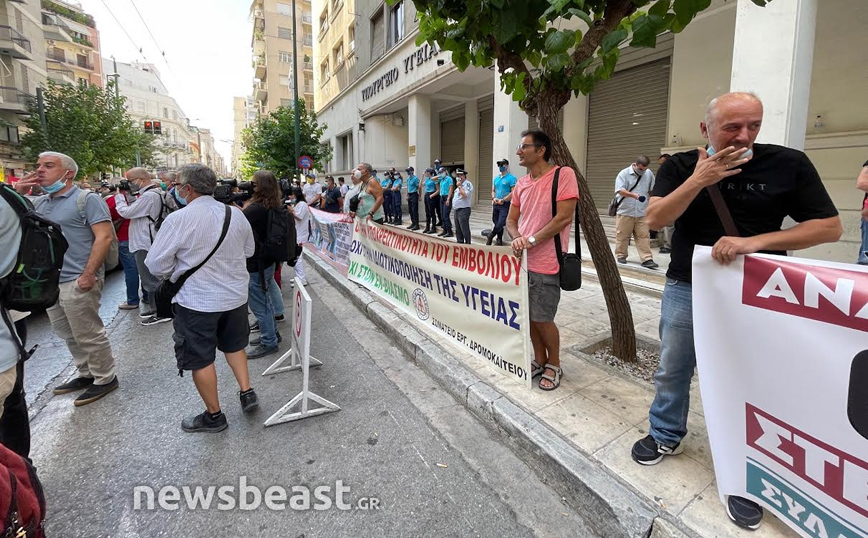 Συγκέντρωση διαμαρτυρίας πραγματοποιούν αυτή την ώρα έξω από το υπουργείο Υγείας υγειονομικοί δείχνοντας την αντίθεσή τους στην υποχρεωτικότητα του εμβολίου κατά του κορονοϊού.
