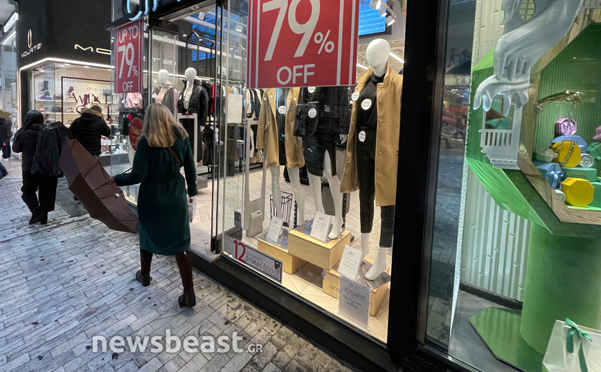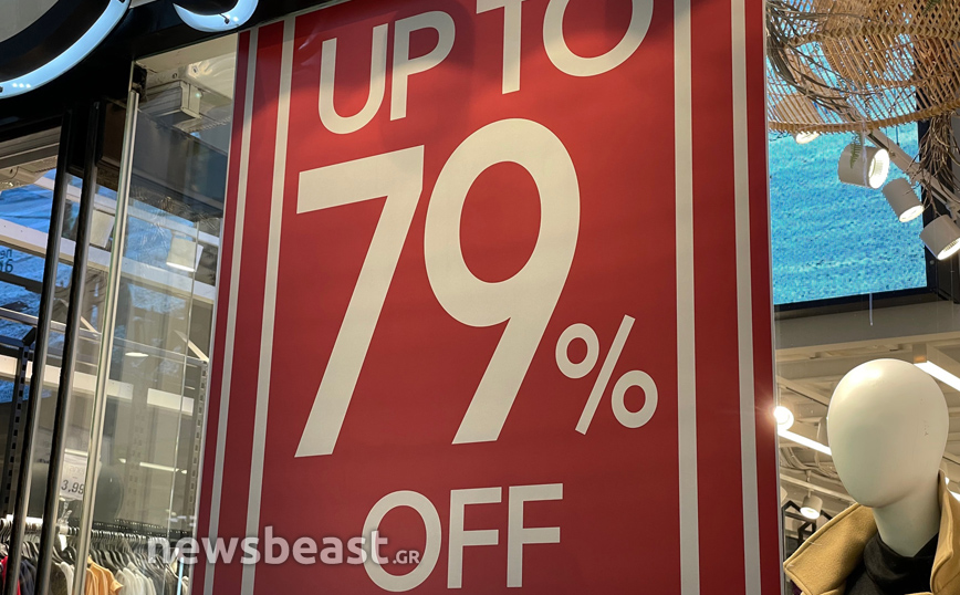 Πολλές βιτρίνες ενημερώνουν τους καταναλωτές για εκπτώσεις «όλα μισή τιμή» ή ακόμη και 79% στα προϊόντα τους.