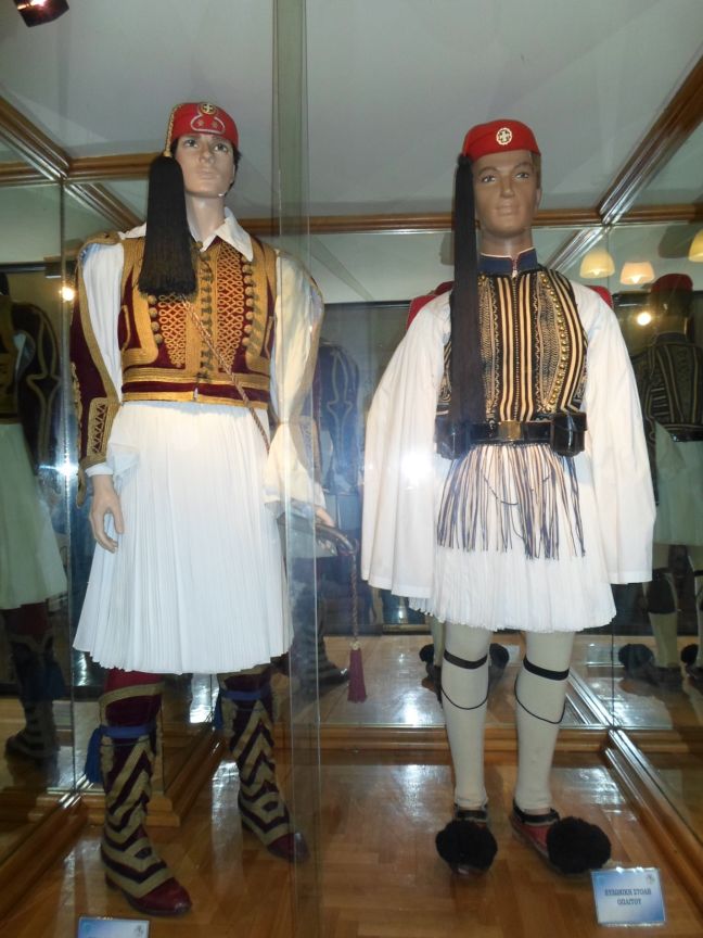 Φωτογραφία της προθήκης στο γραφείο Διοίκησης της προεδρικής Φρουράς, όπου φυλάσσονται η στολή του εύζωνα αξιωματικού (αριστερά) και η στολή του εύζωνα οπλίτη (δεξιά). Πηγή: Διεύθυνση Νεώτερου Πολιτιστικού Αποθέματος και Άυλης Πολιτιστικής Κληρονομιάς/ Υπουργείο Πολιτισμού, Παιδείας και Θρησκευμάτων