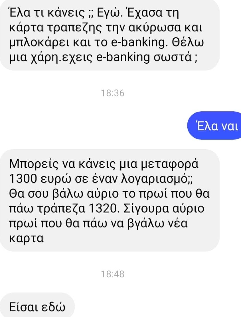 Όπως θα δείτε στη φωτογραφία πιο κάτω έστειλαν σε μια ανυποψίαστη γυναίκα μήνυμα και ζήτησαν να δώσει το ποσό των 1.300 ευρώ σε έναν φίλο της, ο οποίος υποτίθεται ότι είχε χάσει την κάρτα του.