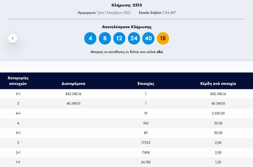 Οι τυχεροί αριθμοί λοιπόν, στη σημερινή κλήρωση Τζόκερ είναι οι εξής: 4, 8, 12, 24, 40 και Τζόκερ το 18.