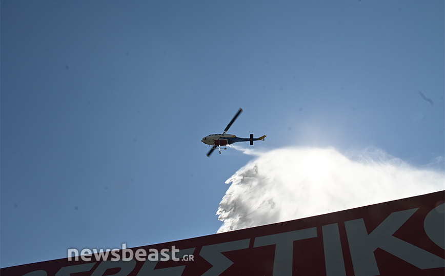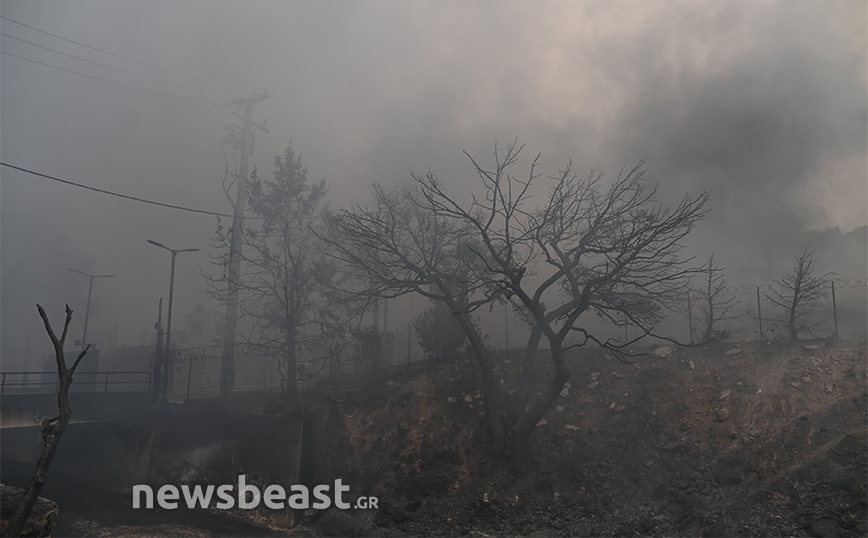 Η ατμόσφαιρα στην περιοχή είναι αποπνικτική και ο ουρανός από τους έντονους καπνούς έχει γίνει γκρι, ενώ τα δέντρα έχουν γίνει όλα κάρβουνο.