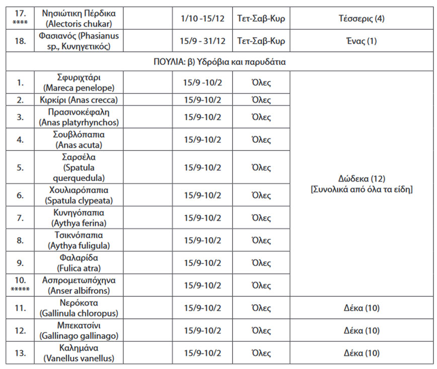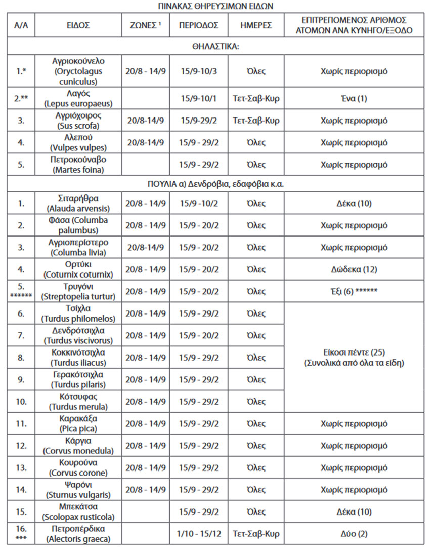 Στην υπουργική απόφαση παρατίθενται τα 36 είδη που επιτρέπεται να κυνηγηθούν, τα οποία εντάσσονται σε τρεις βασικές κατηγορίες: α)Θηλαστικά, β) Πουλιά δενδρόβια, εδαφόβια κ.ά., γ) Πουλιά υδρόβια και παρυδάτια.