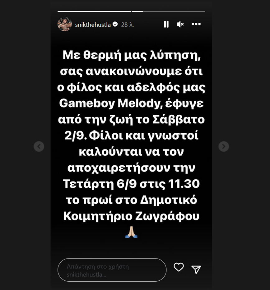 Σε ηλικία μόλις 23 ετών έφυγε από τη ζωή ο τράπερ Gameboy Melody. Την είδηση έκανε γνωστή ο Snik σε δημοσίευσή του, μέσα από τον προσωπικό του λογαριασμό στο Instagram.