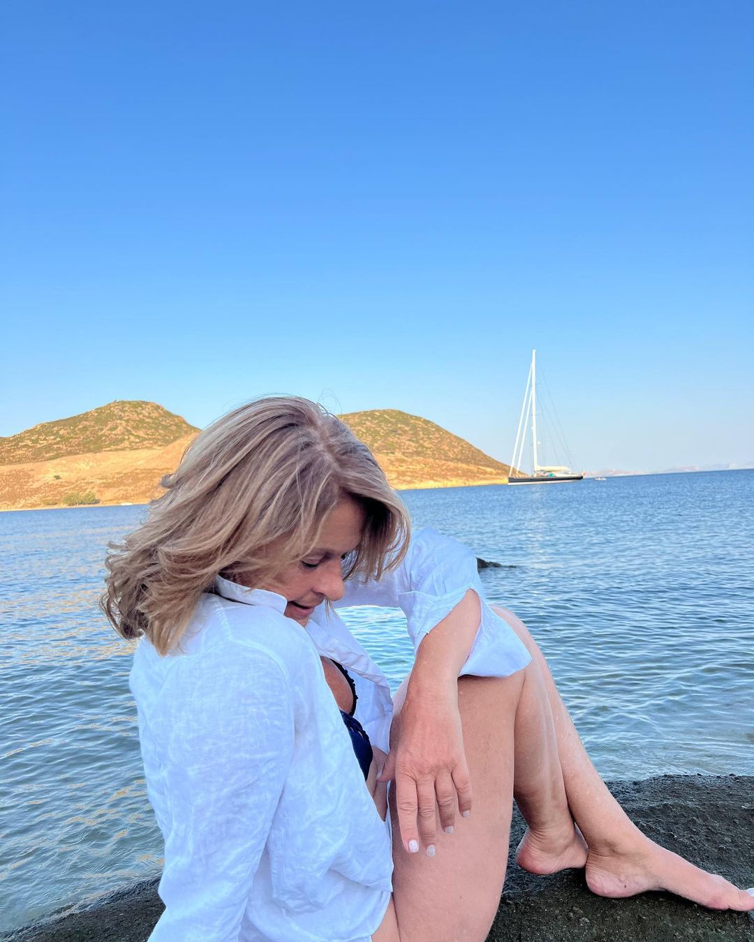 Η Πέγκυ Σταθακοπούλου κάνει διακοπές στην Πάτμο και δημοσίευσε στο προφίλ της στο Instagram φωτογραφίες της με μπικίνι και ένα λευκό πουκάμισο.