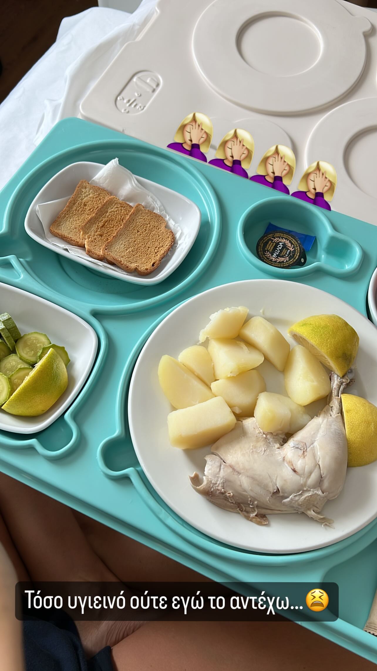 Σε νέο story που έκανε το μεσημέρι της Πέμπτης, 22/08, η Έλλη Κοκκίνου καταγράφει το γεύμα που της πρόσφεραν για μεσημεριανό στο νοσοκομείο, με τον δίσκο της να περιέχει βραστό κοτόπουλο και πατάτες, καθώς και φρυγανιές, αλλά και βραστά κολοκυθάκια. Η τραγουδίστρια έγραψε με χιουμοριστική διάθεση: «Τόσο υγιεινό, ούτε εγώ το αντέχω».