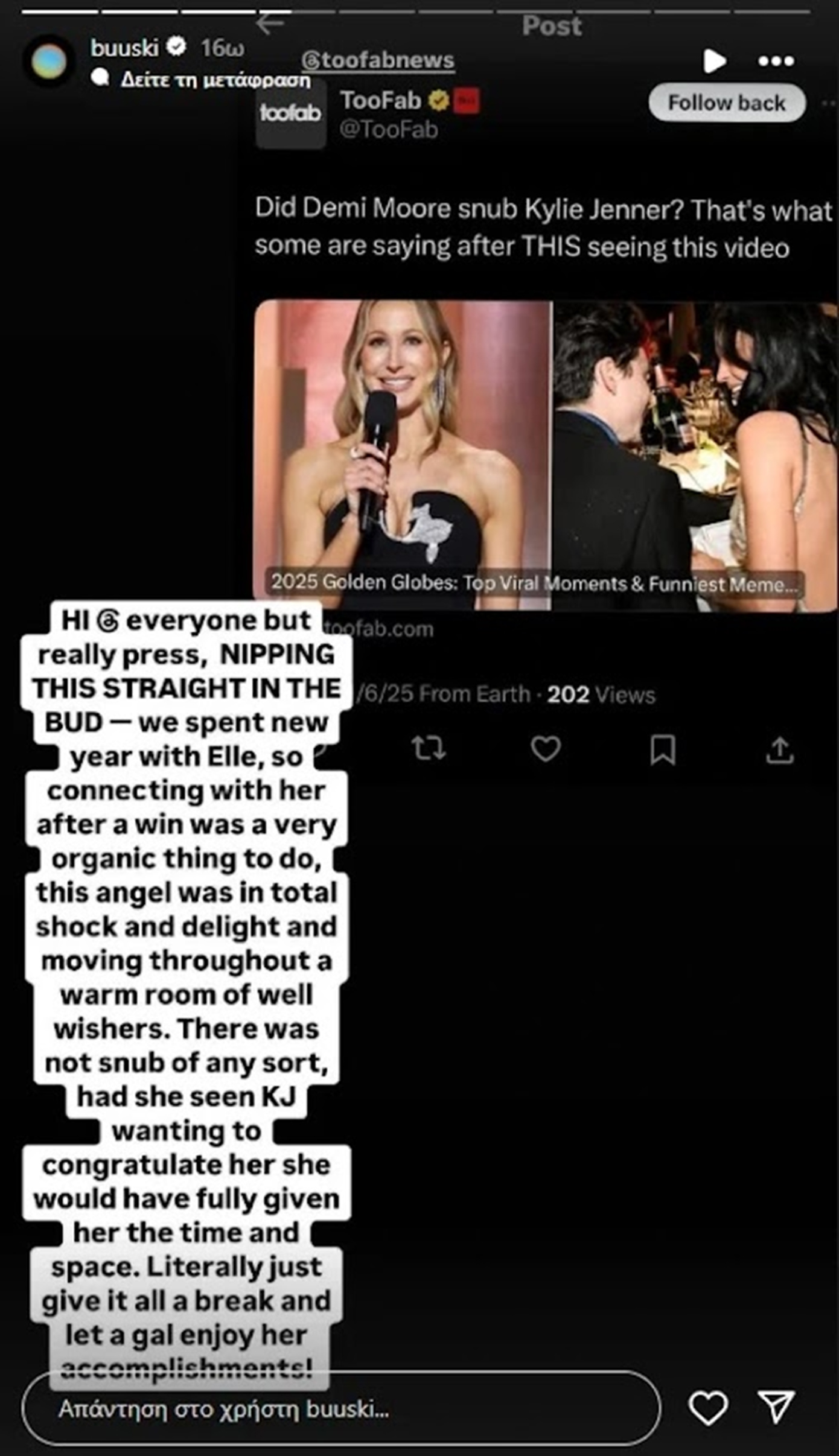 Η κόρη της Ντέμι Μουρ, Ταλούλα Γουίλις, σχολίασε επίσης το περιστατικό ξεσπώντας με μήνυμα στο Instagram: «Δεν υπήρξε κανένα σνομπάρισμα. Αν η μητέρα μου είχε αντιληφθεί την Κάιλι, θα της είχε δώσει την προσοχή που χρειαζόταν. Απλά αφήστε την γυναίκα να απολαύσει τη στιγμή της!».