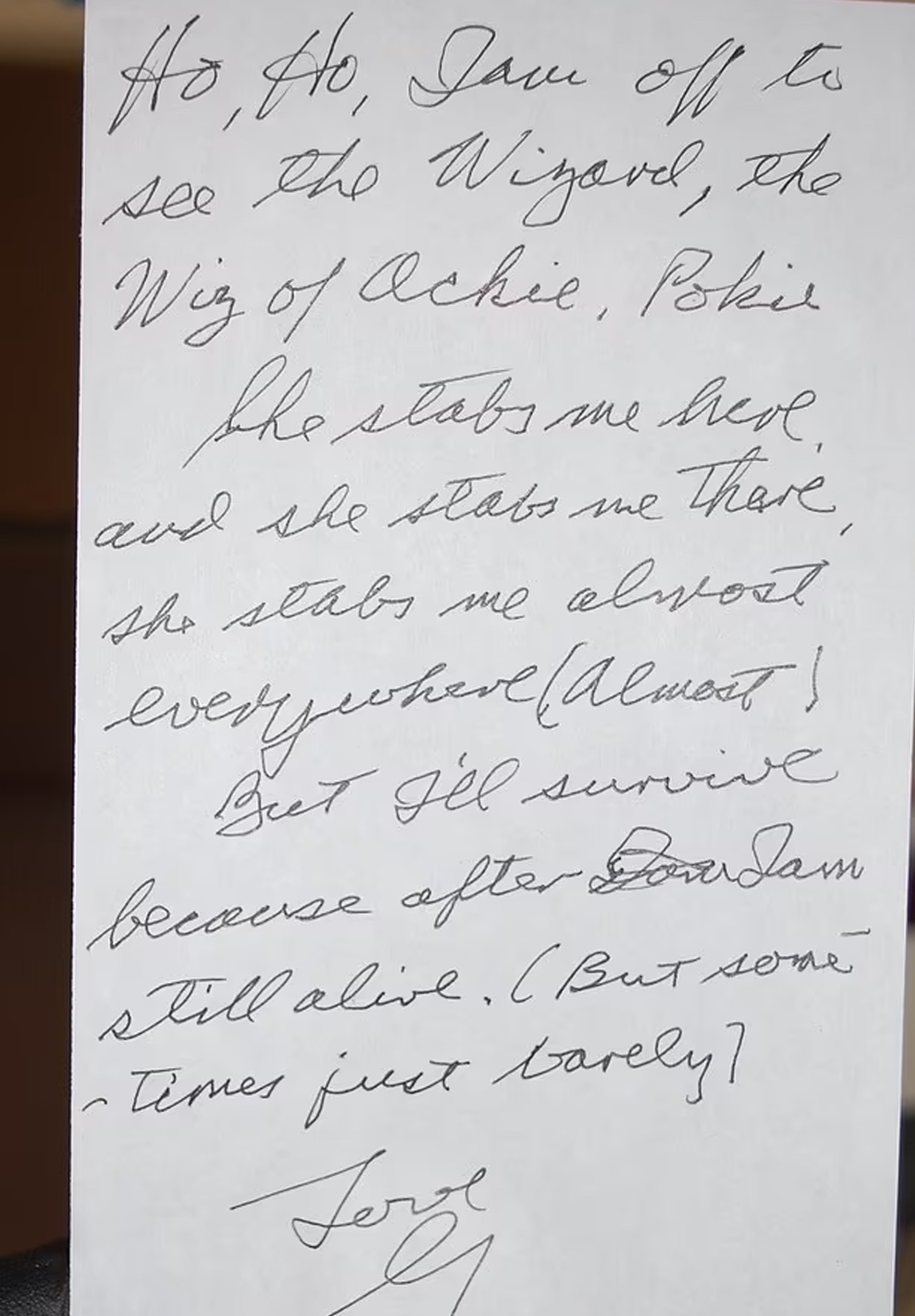 Ένα άλλο σημείωμα δείχνει πως ο Χάκμαν, ο οποίος έπασχε από Αλτσχάιμερ, φαινόταν να έχει επίγνωση της κατάστασής του:«Χο, χο, πάω να δω τον Μάγο, τον Γουίζ του Άτσι, Πόκι,» έγραψε. «Με τρυπάει εδώ και με τρυπάει εκεί, με τρυπάει σχεδόν παντού (σχεδόν). Αλλά θα επιζήσω, γιατί ακόμα είμαι ζωντανός. (Αν και μερικές φορές μόλις και μετά βίας)».
