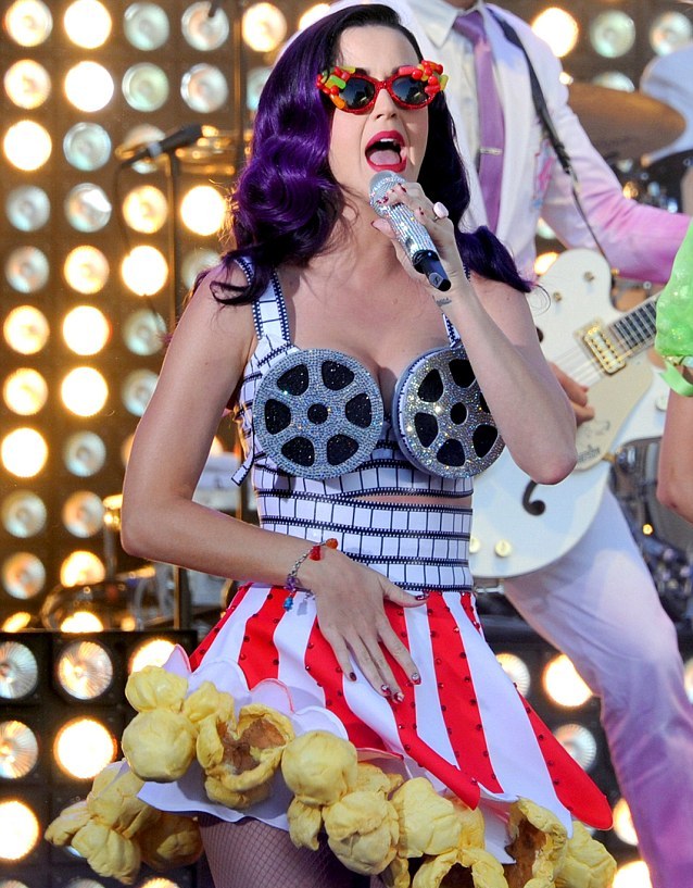 Αυτή τη φορά βγήκε μέσα από ένα γιγάντιο κουτί για ποπ κορν φορώντας ένα ακόμη εκκεντρικό πολύχρωμο ποπ σύνολο -σαν αυτά τα οποία μας έχει συνηθίσει- με έντονες αναφορές στον κινηματογράφο και το… ποπ κορν και τραγούδησε κάποιες από τις επιτυχίες της.