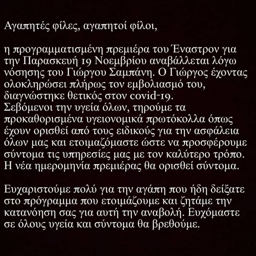 Συγκεκριμένα η ανακοίνωση αναφέρει: «Αγαπητές φίλες, αγαπητοί φίλοι. Η προγραμματισμένη πρεμιέρα του Έναστρον για την Παρασκευή 19 Νοεμβρίου αναβάλλεται λόγω νόσησης του Γιώργου Σαμπάνη. Ο Γιώργος έχοντας ολοκληρώσει πλήρως τον εμβολιασμό του διαγνώστηκε θετικός στον Covid-19. Σεβόμενοι την υγεία όλων τηρούμε τα προκαθορισμένα υγειονομικά πρωτόκολλα όπως έχουν οριστεί από τους ειδικούς για την ασφάλεια όλων μας και ετοιμαζόμαστε ώστε να προσφέρουμε σύντομα τις υπηρεσίες μας με τον καλύτερο τρόπο. Η νέα ημερομηνία πρεμιέρας θα οριστεί σύντομα.
