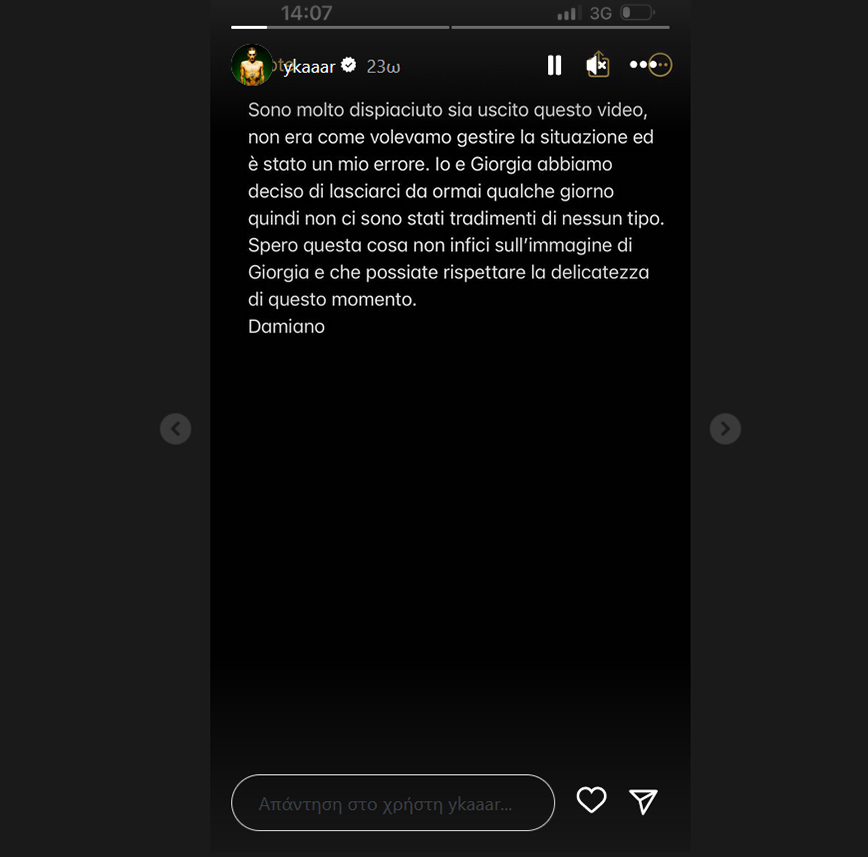 Την επιβεβαίωση πως πρόκειται για αυτόν, όμως, έδωσε ο ίδιος. Με μια δημοσίευση στα stories του προσωπικού του λογαριασμού στο Instagram, ο Νταμιάνο απολογήθηκε για τον τρόπο που διαχειρίστηκε την κατάσταση, ενώ επιβεβαίωσε πως η σχέση του με την Τζόρτζια Σολέρι είναι παρελθόν.