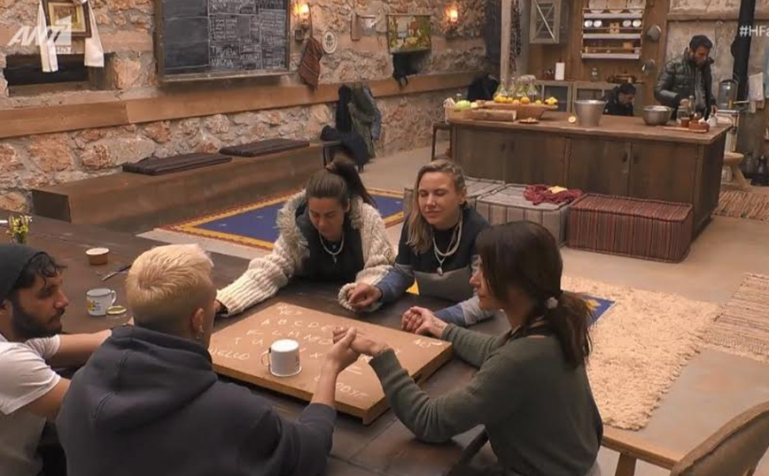 Πιασμένοι χέρι με χέρι όλοι μαζί παρακολουθούσαν τον Τάσο Ξιαρχό να προσπαθεί να καλέσει τα πνεύματα προκειμένου να τα ρωτήσει ποιος θα αποχωρήσει στο τέλος της βραδιάς.