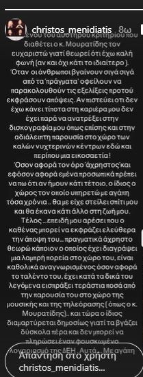 Συγκεκριμένα, ο Χρήστος Μενιδιάτης δημοσίευσε ένα μακροσκελές κείμενο στον λογαριασμό του στο instagram στο οποίο ανέφερε: