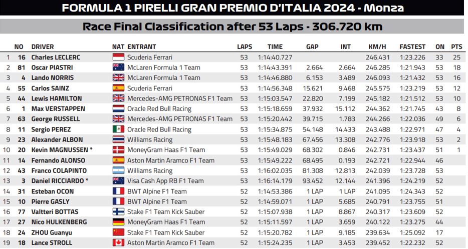 Η τελική κατάταξη του 16ου Grand Prix στη Μόντσα έχει ως εξής: