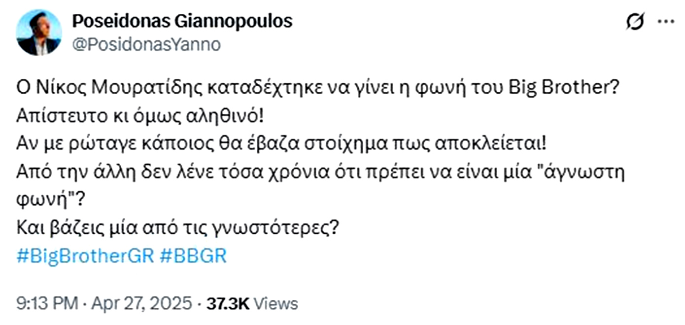 Ο γνωστός ραδιοφωνικός παραγωγός Ποσειδώνας Γιαννόπουλος ήταν από τους πρώτους που «κάρφωσε» το πρόσωπο, μέσα από ανάρτησή του στο X, γράφοντας με έκπληξη: «Ο Νίκος Μουρατίδης καταδέχτηκε να γίνει η φωνή του “Big Brother”; Απίστευτο κι όμως αληθινό!»
