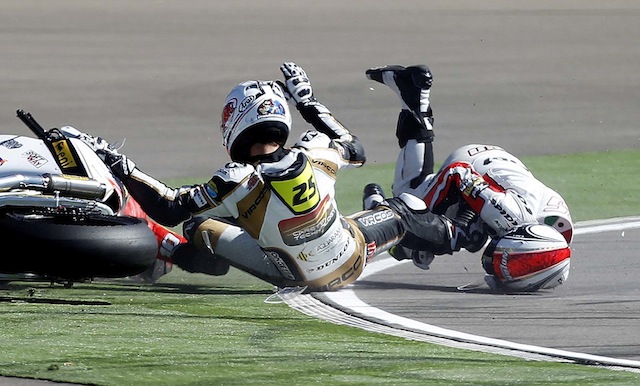 Οι πτώσεις στην Moto2 έφτασαν τις 344 σε 17 αγωνιστικά Σαββατοκύριακα. Είχαμε δηλαδή κάτι περισσότερο από 20 πτώσεις ανά τριήμερο. Ακόμη: στη Moto2 αγωνίστηκαν φέτος 29 αναβάτες ανά αγώνα, οπότε ένας άλλος, αυθαίρετος είναι αλήθεια υπολογισμός, θα μάς δώσει 11,86 πτώσεις για κάθε αναβάτη φέτος.