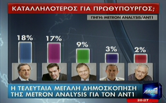 Καταλληλότερος για πρωθυπουργός ο Α. Σαμαράς με 18%, ακολουθούν Α. Τσίπρας με 17% και Ε. Βενιζέλος με 9%.