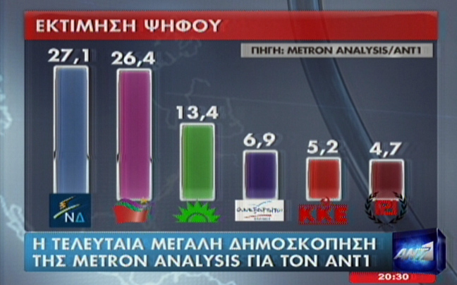 Νέα δημοσκόπηση της Metron Analysis για τον ΑΝΤ1 δίνει οριακό προβάδισμα στην πρόθεση ψήφου με 0,7 της μονάδας στη Νέα Δημοκρατία.